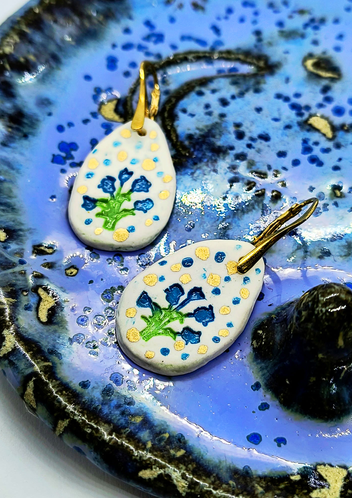 Kolczyki wykonałam własnoręcznie ze szlachetnej porcelany, zdobiłam szkliwem oraz 24-karatowym złotem.