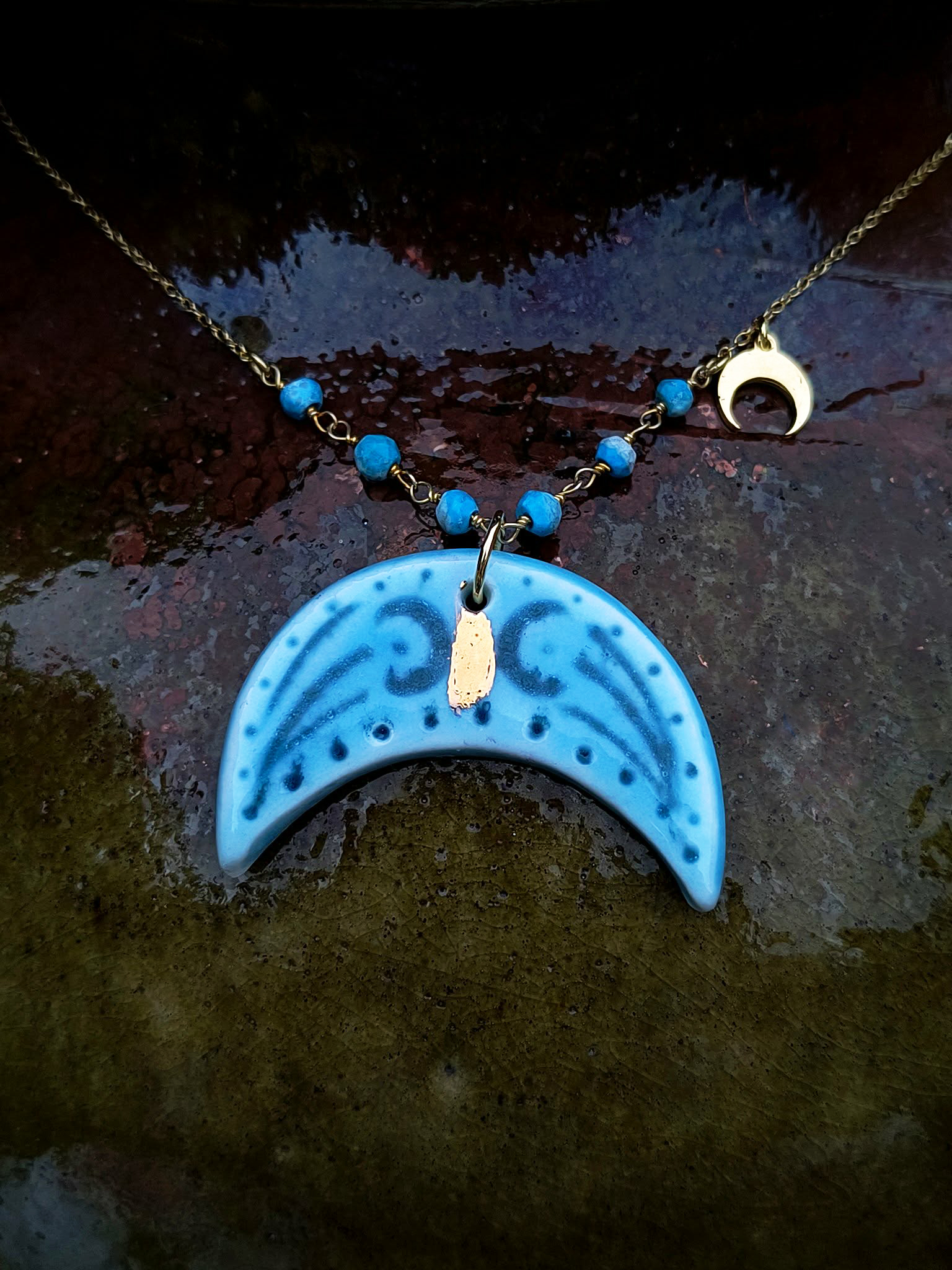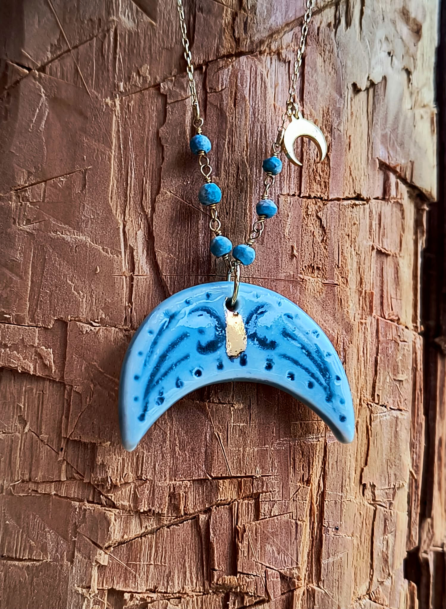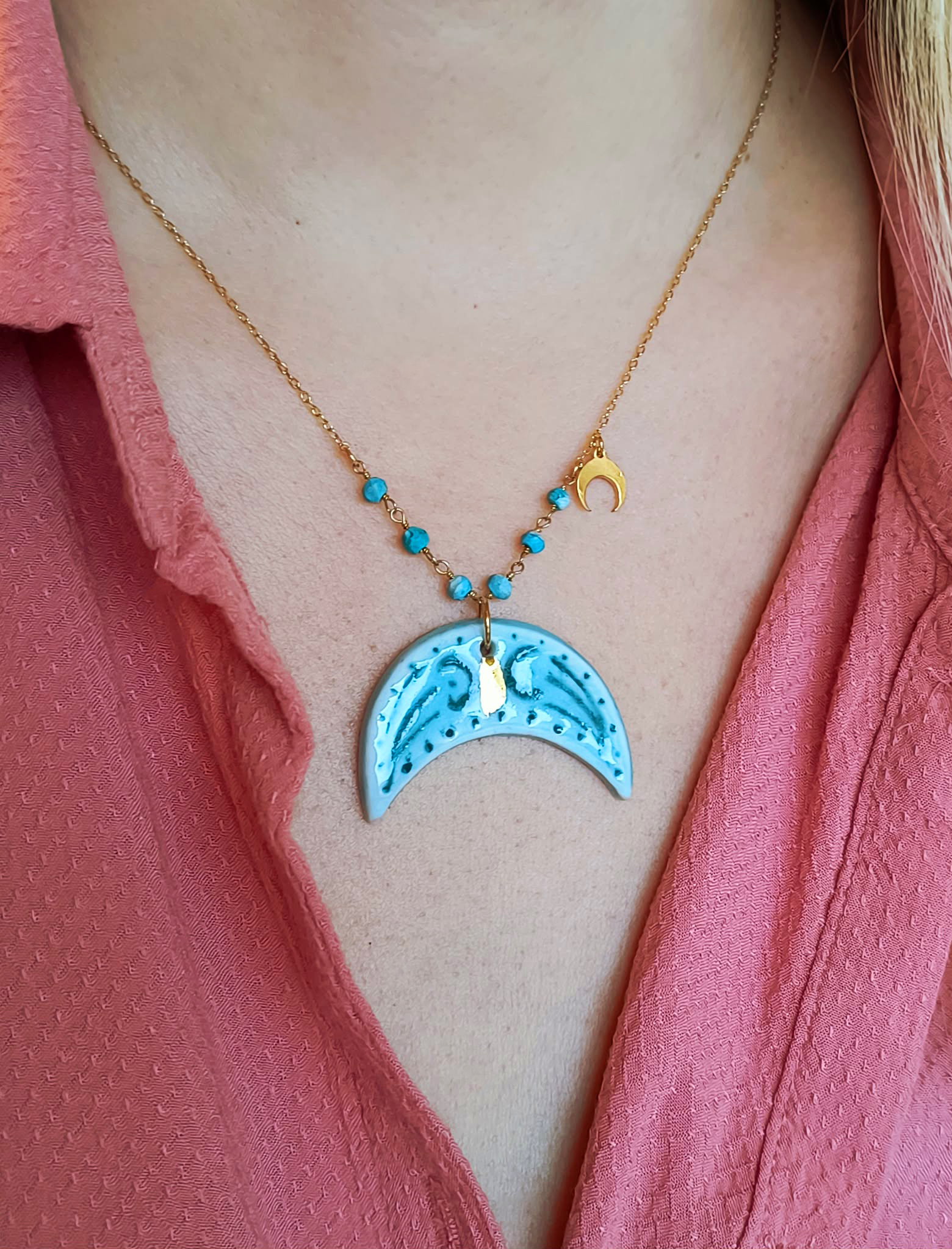 Łańcuszek ozdobiony jest księżycem oraz drobnymi turkusami.