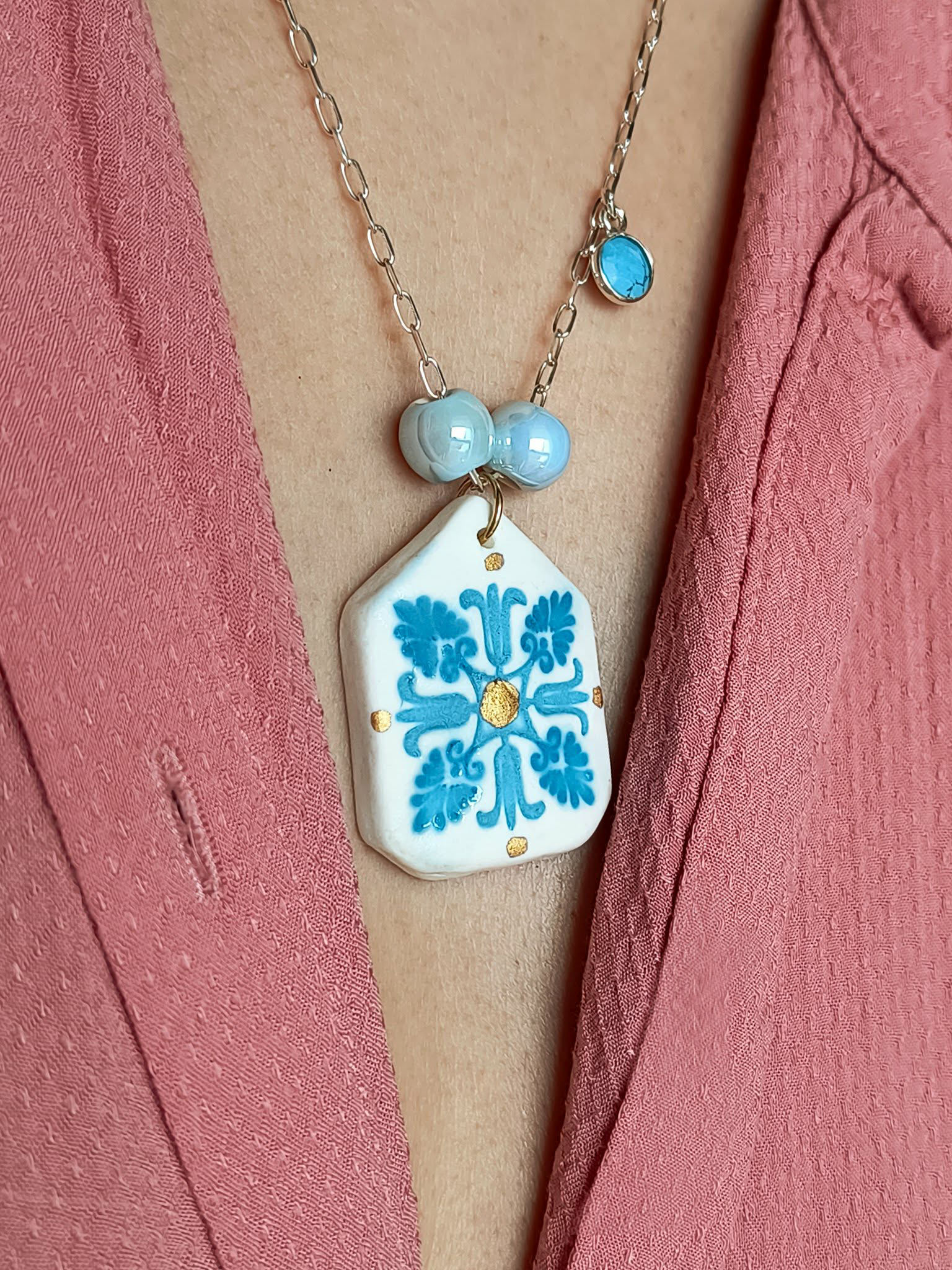 Naszyjnik wykonałam własnoręcznie ze szlachetnej porcelany, ozdobiłam szkliwem oraz 24-karatowym złotem.